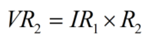 Esta misma corriente es la que circula por la resistencia R2. Entonces la tensión en R2: