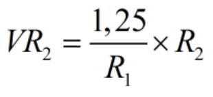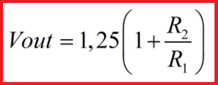 De esta última fórmula se ve claramente que si modifica R2 (resistencia variable), se modifica la tensión Vout. En la fórmula anterior se ha despreciado la corriente (IADJ) que circula entre la patilla de ajuste (ADJ) y la unión de R1 y R2. Esta corriente se puede despreciar, tiene un valor máximo de 100 uA y permanece constante con la variación de la carga y/o de la tensión de entrada. Para mejorar la regulación el resistor R1 se debe colocar lo más cercano posible al regulador, mientras que el terminal que se conecta a tierra del resistor R2 debe estar lo más cercano posible a la conexión de tierra de la carga