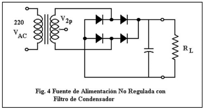 Las fuentes no reguladas, son aquellas en las cuales el voltaje de salida permanece constante por lo general constan de un transformador, un rectificador (por lo general tipo puente) y un filtro (que en el caso de las fuentes en el rango de voltajes y potencias bajas es puramente capacitivo).