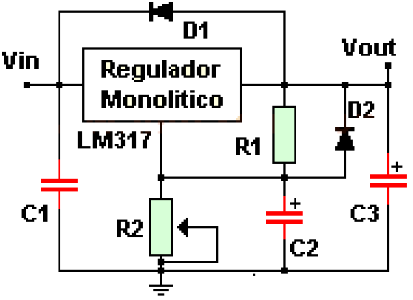 Se pone un diodo D2 (1N4001) para proteger al regulador contra posibles cortos circuitos en la salida al dar camino a la descarga de capacitores.