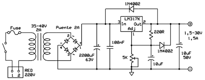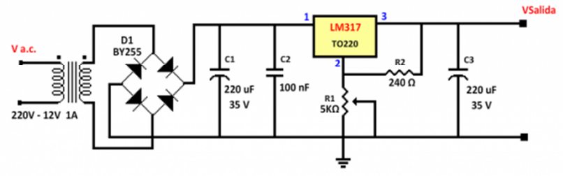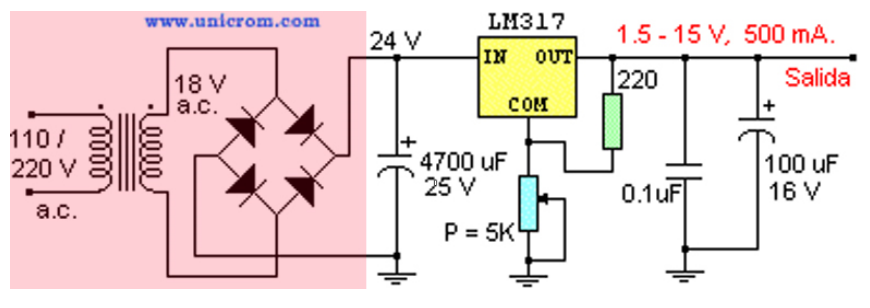 Esquema de fuentes de alimentación regulada por regulador LM 317