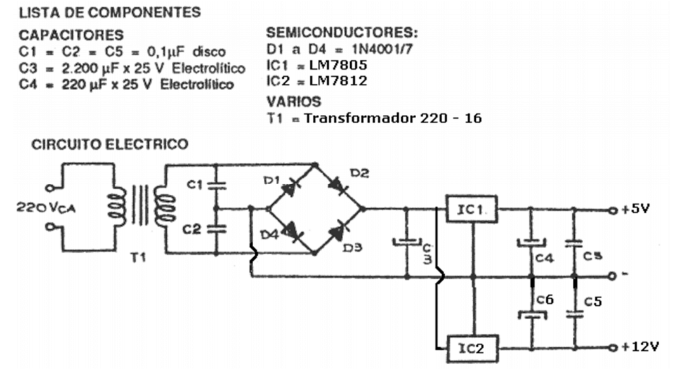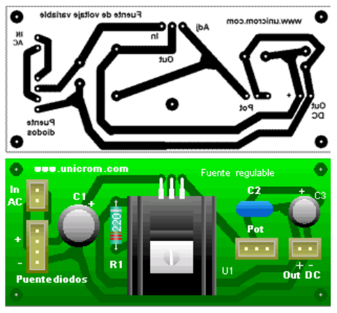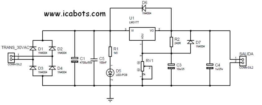 Se pone un diodo D1 (1N4001) para proteger el regulador contra posibles cortos circuitos en la entrada del regulador.